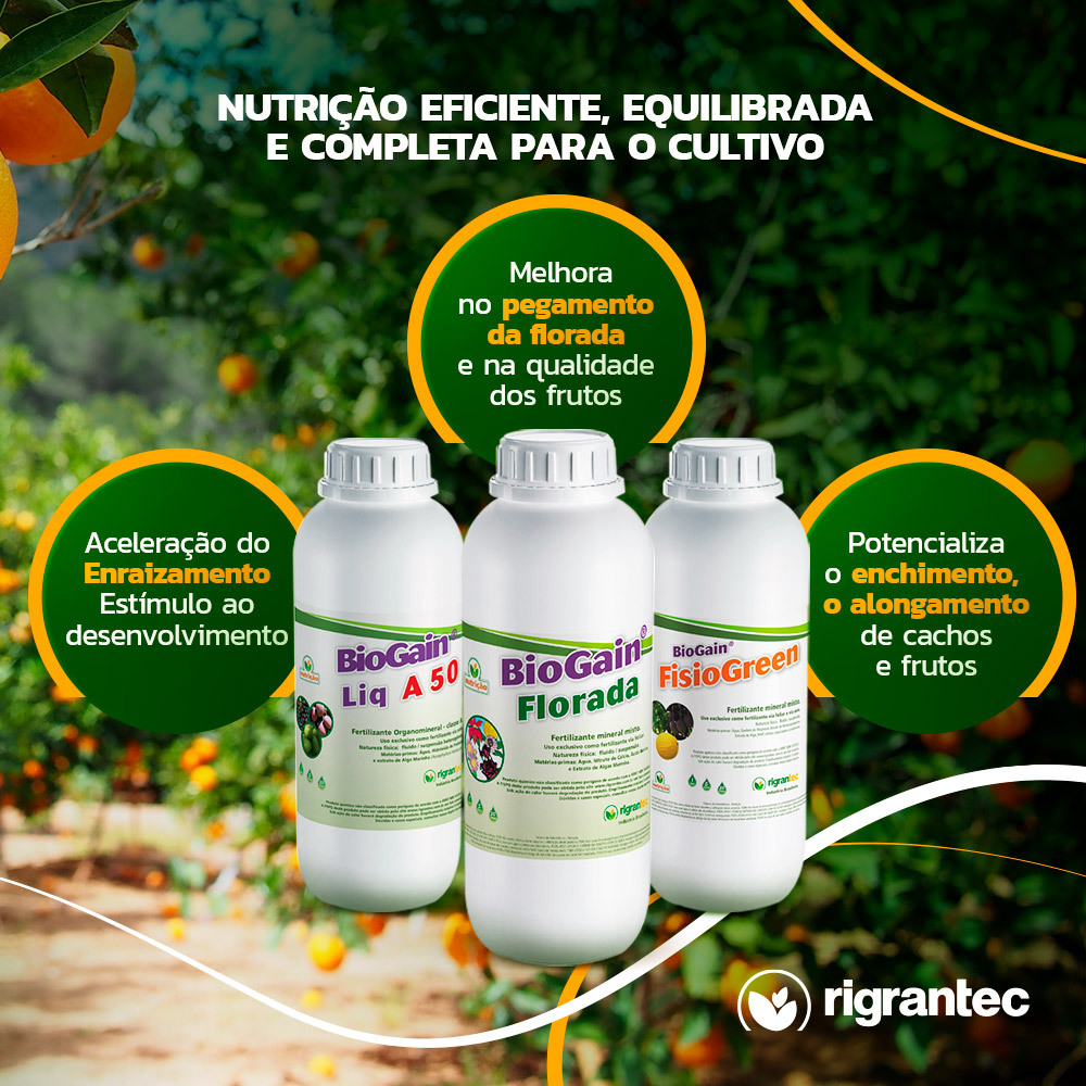 BioGain FisioGreen é um fertilizante mineral misto em formulação líquida, com forte ação bioestimulante. Possui uma combinação ideal de Fósforo, Nitrogênio, Potássio, Magnésio e Boro em formulações nobres.