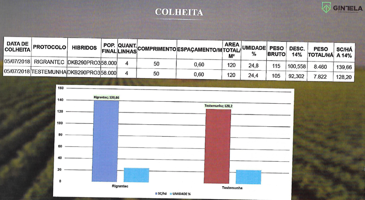 Com a aplicação de Micromix Cereais, BioGain NPK e ProSilicon, houve um incremento de 5,2% na produtividade final do milho (em peso de grão colhido / ha), além de ter sido observado melhor sanidade da área tratada com produtos da Rigrantec.