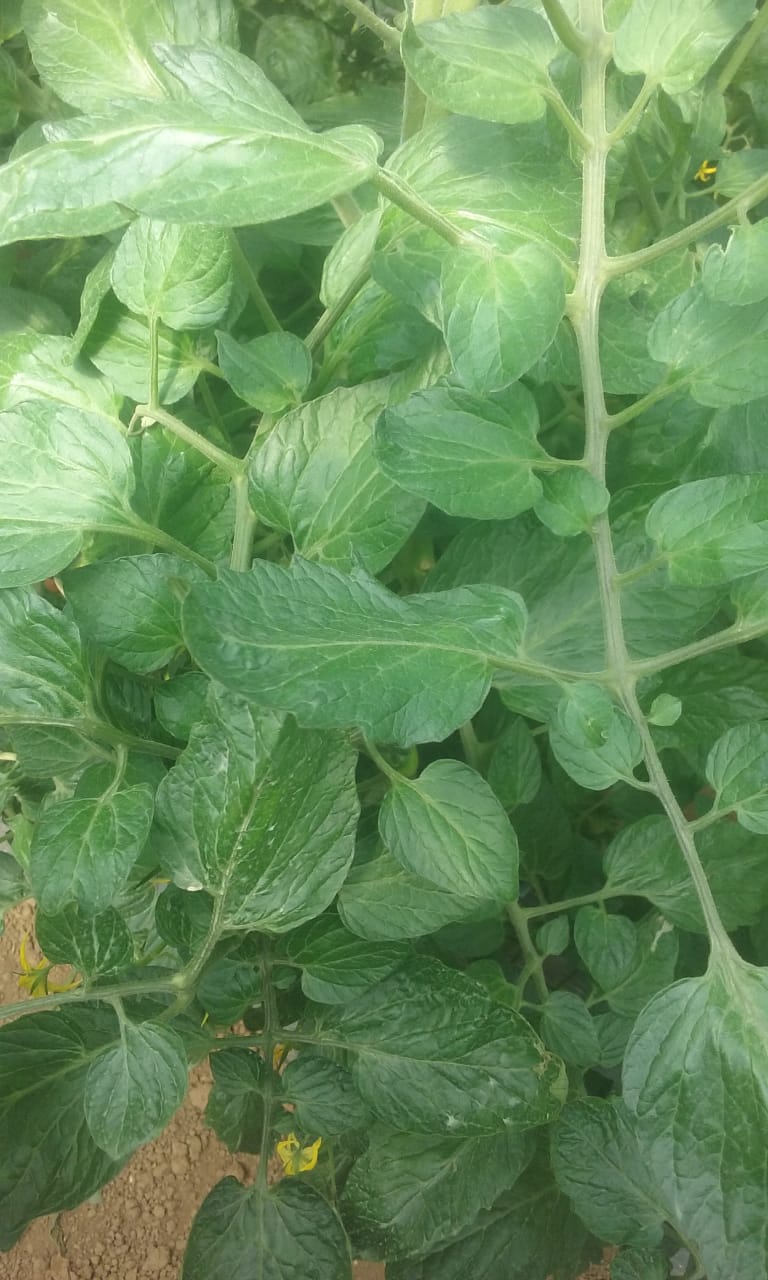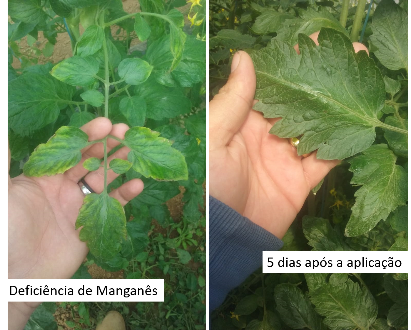 As plantas de tomate cereja foram identificadas com deficiência de Manganês. Folhas inteiras com coloração pálida. Objetivo principal foi corrigir essa deficiência.
