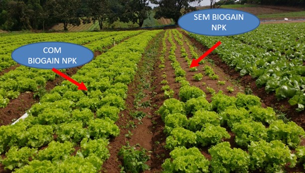 “Apliquei BioGain NPK na bandeja de mudas de alface crespa, na dose de 50 ml/10L água e pulverizei dois dias antes do transplante. Após 15 dias do plantio verifiquei a diferença entre os canteiros com e sem tratamento. Observei maior homogeinidade, plantas com maior desenvolvimento de raiz, bastante superior a testemunha. Vou antecipar o corte da alface.”
