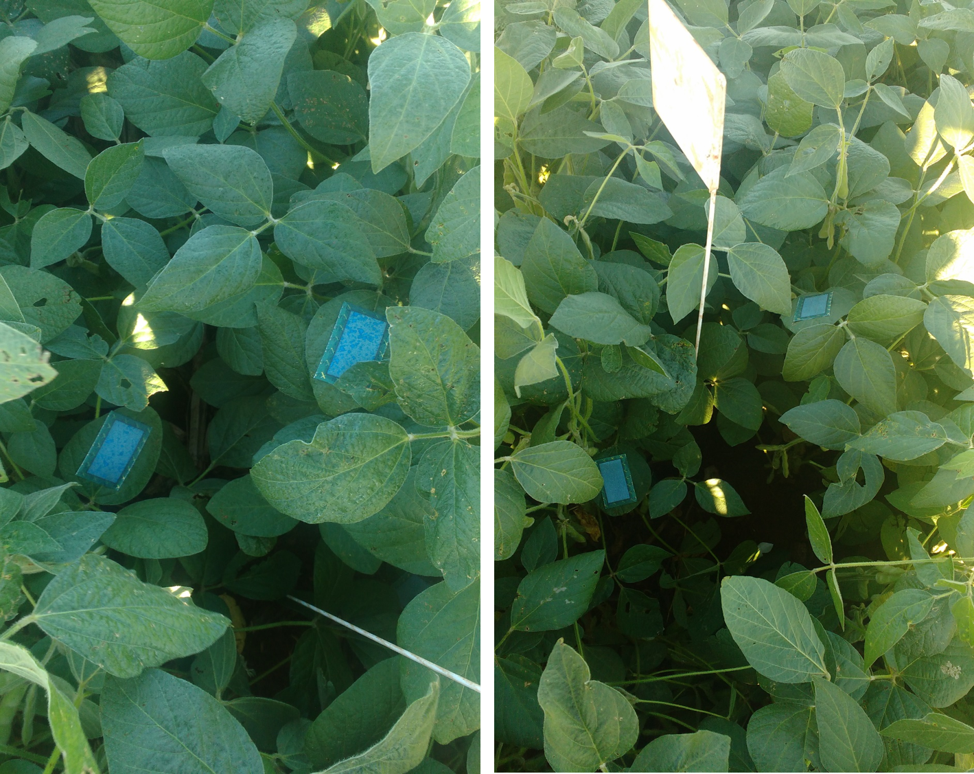 Para avaliar a deriva nas aplicações, observou-se as aplicações à campo de forma visual, e colocou-se papeis sensíveis no dossel nos terços inferior, médio e superior, para avaliar o molhamento, a disposição e o alcance das gotas, conforme a foto abaixo.